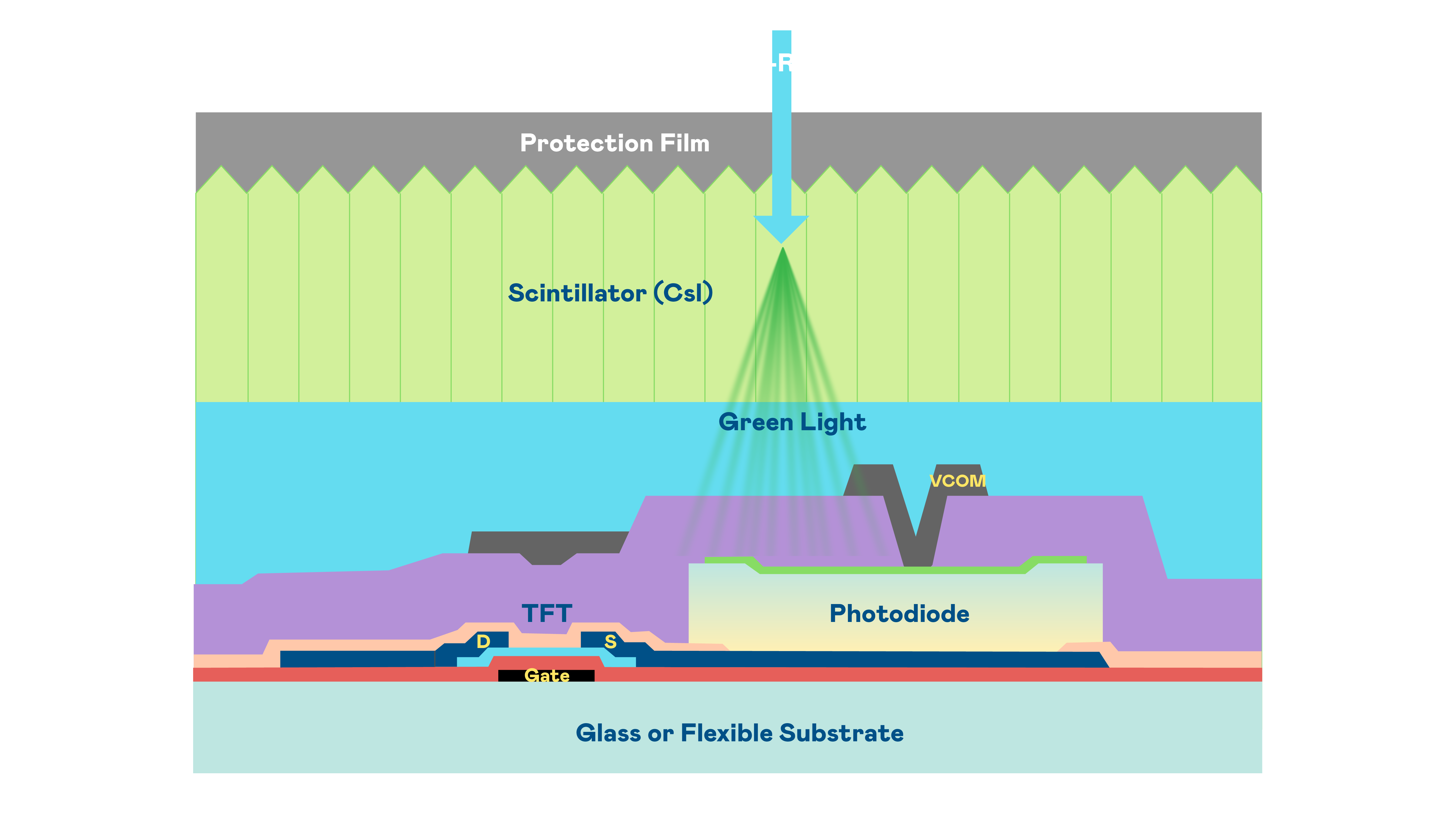 VSport的X光影像感测阵列使用薄膜电晶体 (TFT) 作为每个像素的读取开关,搭配光电二极体(Photodiode)的光电转换元件,用以感测X光影像讯号。